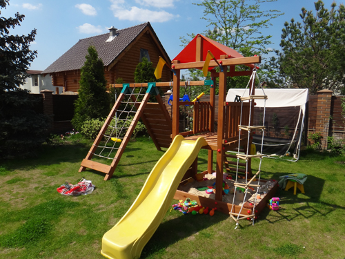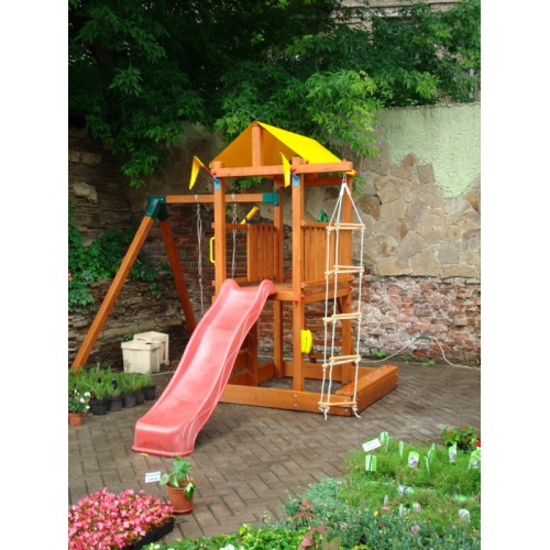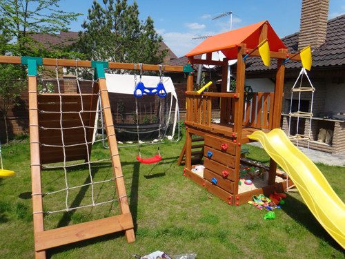 Детское игровое оборудование изготовлено из качественного дерева и пластика, безопасно и устойчиво.